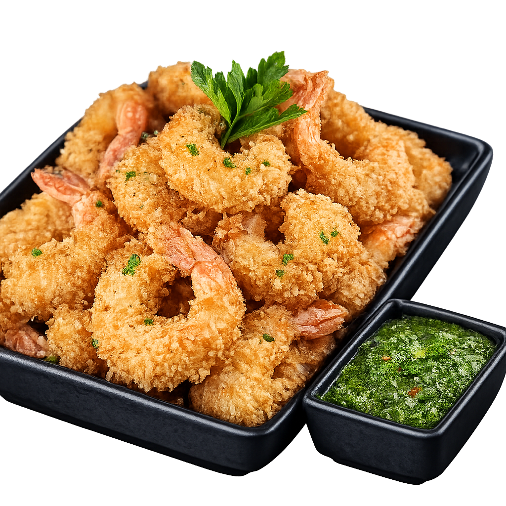 Experience the perfect balance of zesty flavor and satisfying texture with our Crunchy Shrimp. We start with tender, succulent shrimp marinated in fresh lemon juice and a touch of salt to enhance their natural sweetness and provide a bright, clean finish. Each shrimp is then expertly dredged in a custom blend of wheat, corn, and maize flours, creating a light and airy base for our signature breadcrumb coating.